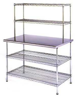 ![]() Consists of: Stainless Steel Table Top (2) - 63" rear chrome posts (2) - 33" front chrome posts (2) - 29" front chrome posts of overshelf (2) - 14"wide chrome wire overshelf (2) - Chrome wire undershelves* |
